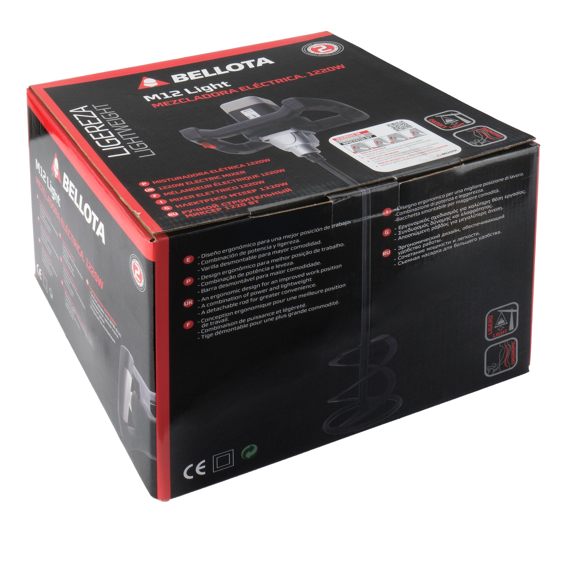 Batidor mezclador Bellota M12 Light 1200 W. Regulación electrónica de la velocidad que adapta la potencia útil en función de la densidad y cantidad del material que se esté mezclando y posibilita un arranque suave que evita que el material a mezclar salpique hacia fuera de forma incontrolada. Velocidad de giro 0-800 r.p.m. Máxima potencia útil en todas las velocidades de trabajo: incluso a velocidades muy reducidas. Empuñaduras bimateriales, de polipropileno y elastómero dispuestos con una inclinación de 20° para una mayor ergonomía. Muy ligero para trabajos muy intensivos. Capacidad de mezcla 40 litros. Marca Bellota.